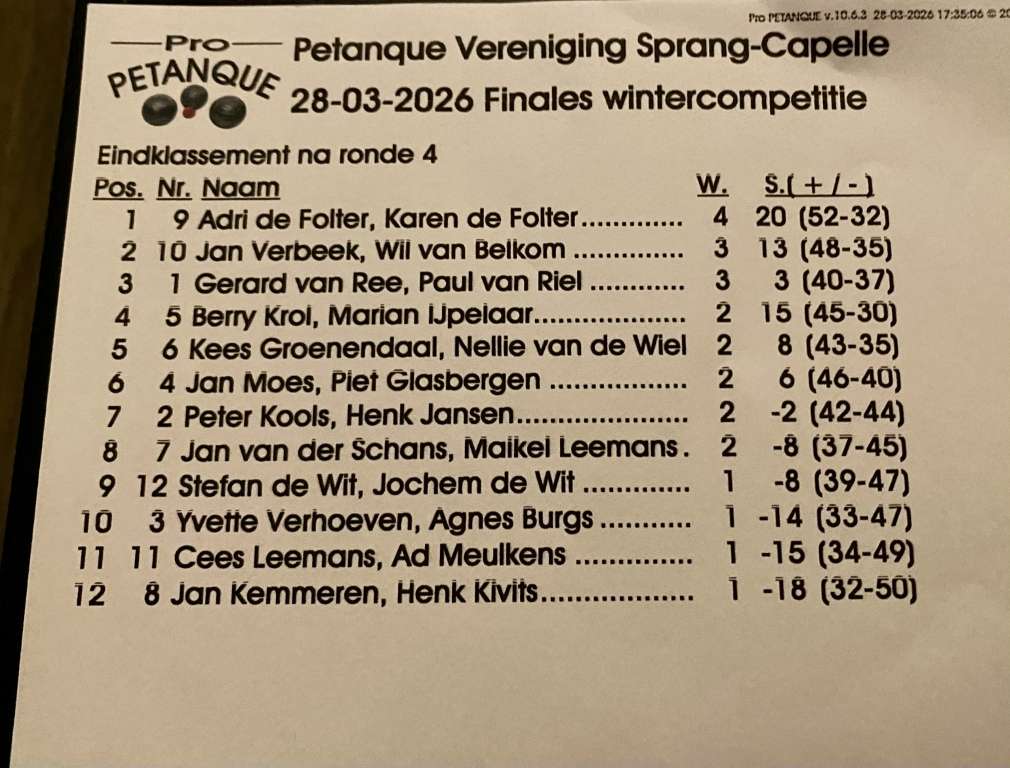 Adri & Karen de Folter waren deze dag ijzersterk en wonnen als enigen al hun vier partijen, waarmee zij zich plaatsten voor de spannende finale. In deze laatste wedstrijd namen zij het op tegen Jan Verbeek & Wil van Belkom en wonnen overtuigend met 13-5.