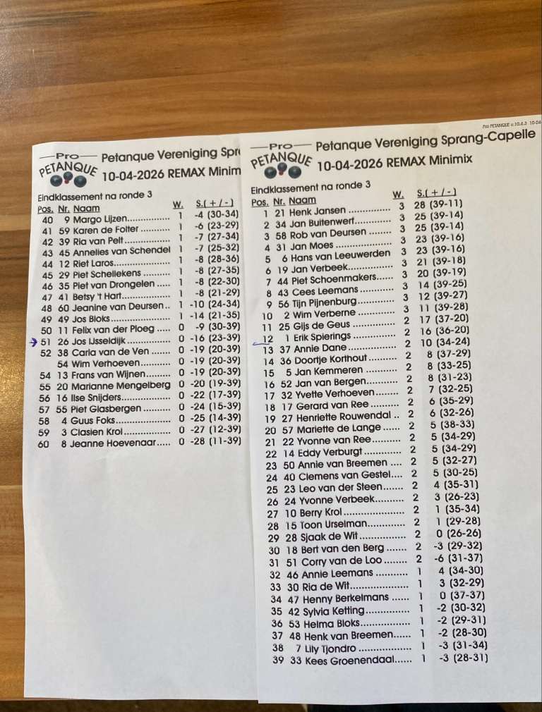 Van de deelnemers waren 33 spelers lid van onze eigen vereniging en mochten we 27 enthousiaste boulers uit Midden-Brabant verwelkomen. Een mooie mix van vertrouwde gezichten en sportieve gasten van buitenaf – precies waar de REMAX Minimix voor staat: verbinding door sport